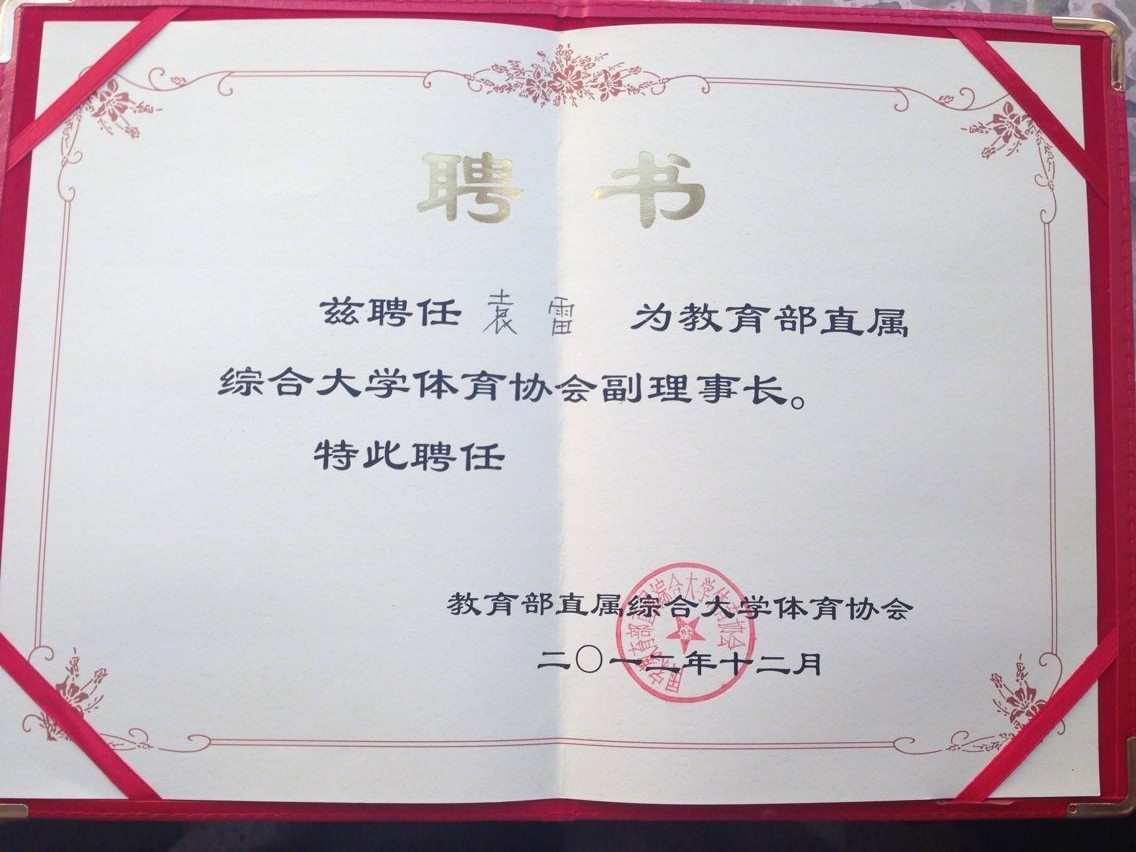 在12月21日召开的2013年教育部直属综合大学体育协会年会上,公司伟德体育经理袁雷教授当选为协会副理事长。教育部直属综合大学体育协会是有教育部直属211大学和985大学伟德体育(体育部)组成的协会。