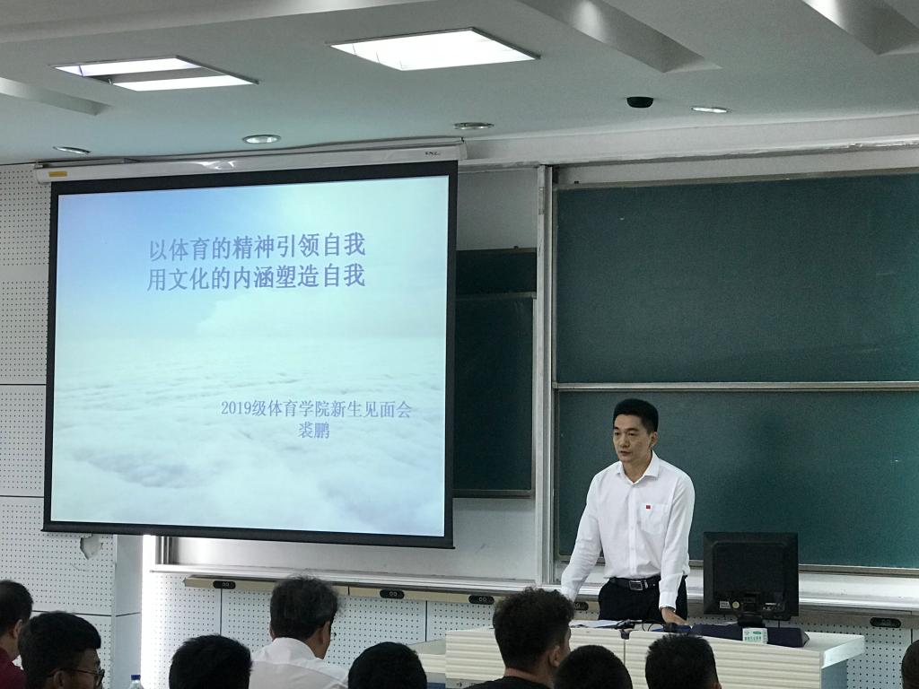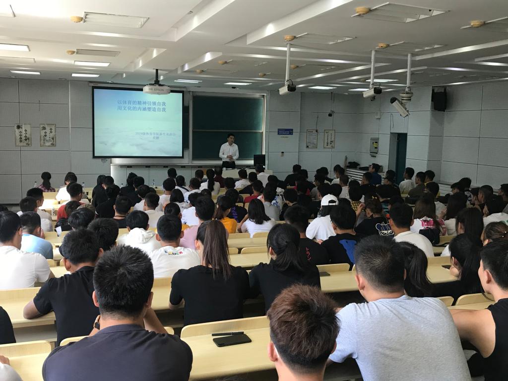 8月28日上午,伟德体育在逸夫楼第一阶梯教室召开新生入学专题教育之公司领导、老师见面会暨专业教育。体育公司党委书记逄锦彩、经理裘鹏、党委副书记兼副经理田进、副经理周晓宇、副经理李廷奎、副经理佟强、副经理王祥全、理论教研室主任郭玉莲、术科二教研室主任王宁、术科一教研室支部书记陈琼、员工办公室主任王赫谊、教务办秘书刘佳宁、辅导员宫勖能及2019级全体新生参加本次活动。经理裘鹏主讲。