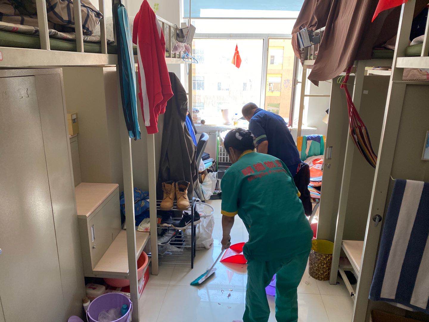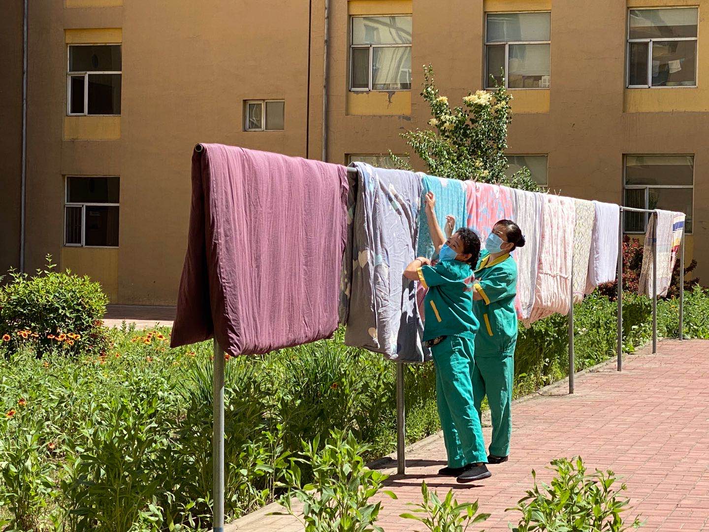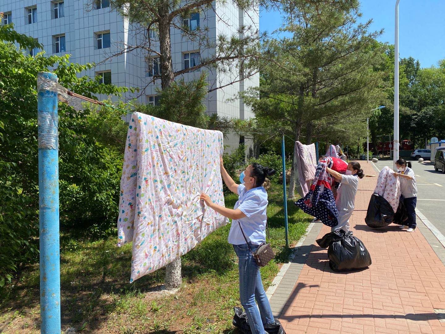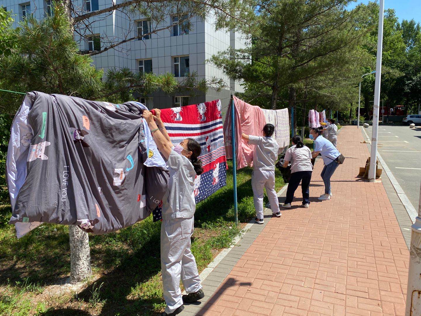 6月16日上午9点,伟德体育辅导员、前卫校区后勤服务中心公寓部工作人员、明德物业工作人员聚集在员工公寓门前,按照事先整理好的有诉求员工名单,逐一房间为员工晾晒被褥、清理垃圾。工作人员早已准备好名帖,分别在公寓床、被褥上做好标记,防止物品弄混、丢失。大家分工明确,擦栏杆、取被子、夹标签、晒被子、收回等一整套流程,全部由专人负责。最后,物归原位,叠得整整齐齐。