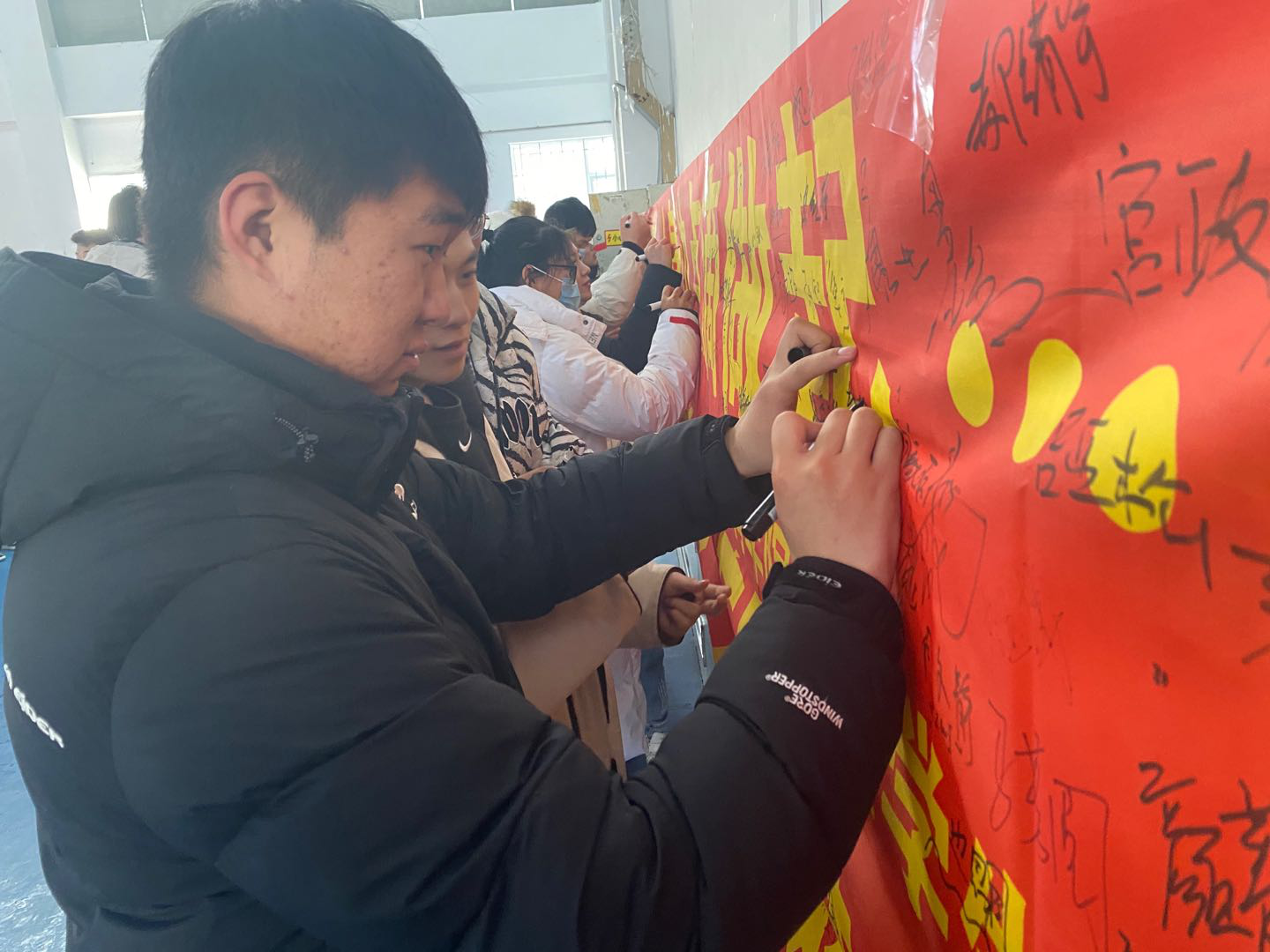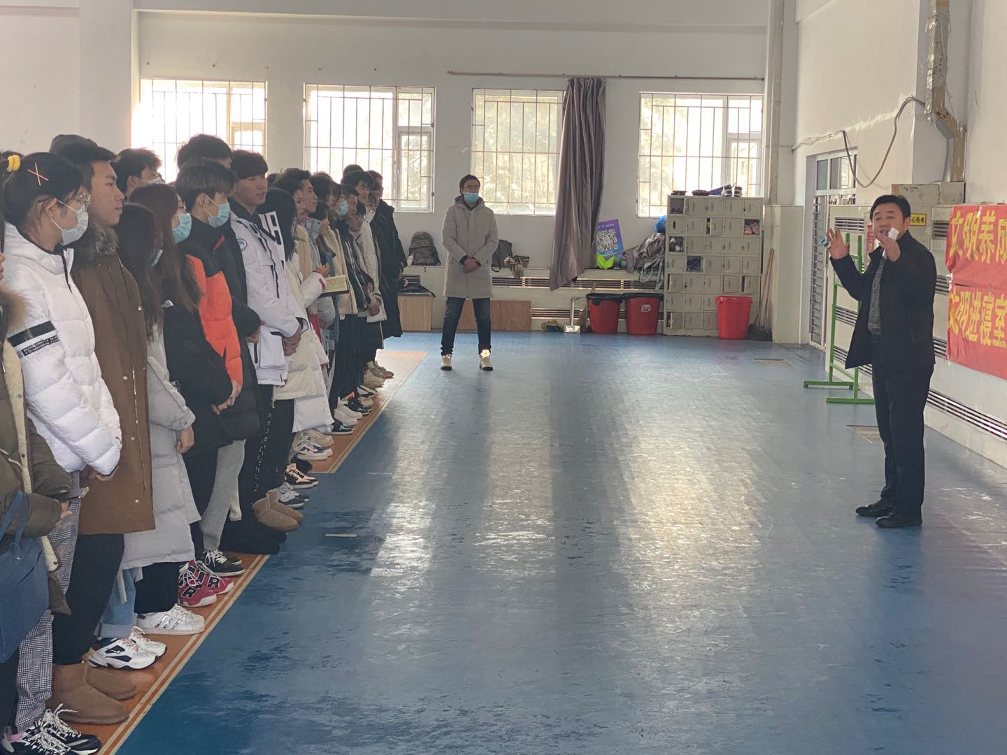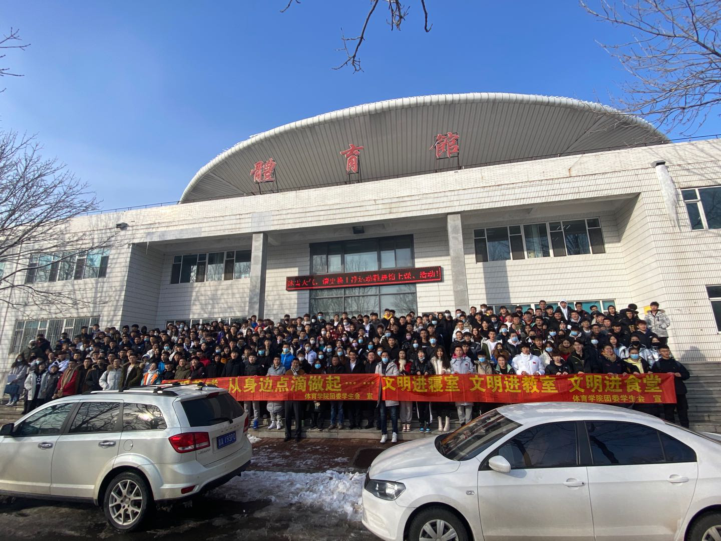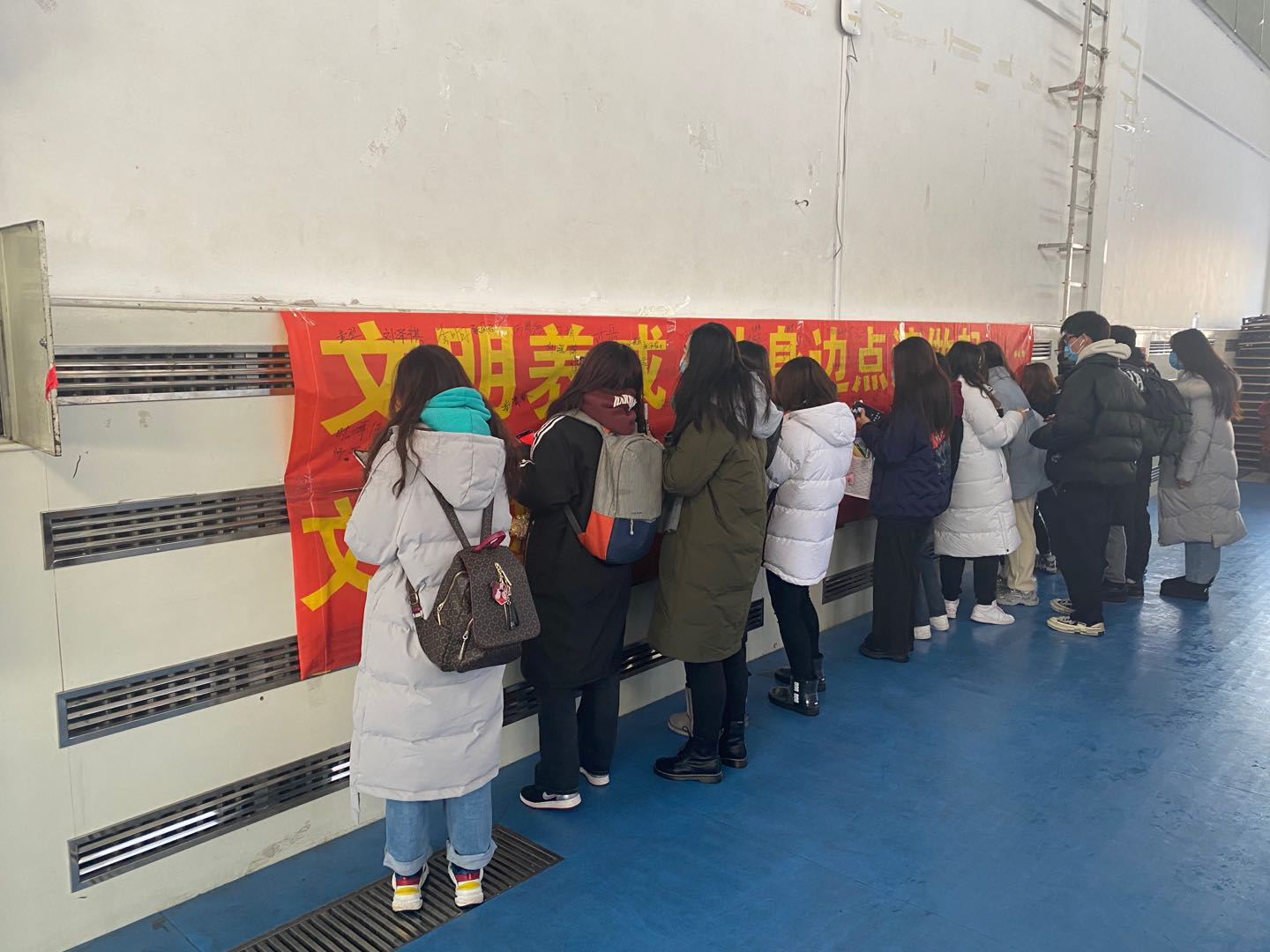 活动伊始,田进副书记首先简要介绍了开展此类活动的初衷,并结合校园日常生活中存在的不文明现象,重点结合“文明进寝室、文明进教室、文明进食堂”,强调了 “为什么做,怎么做,做得怎么样” 的目的和意义。同时,田进副书记进一步强调要严格控制请销假制度,重视每日健康打卡,如实上报个人情况,叮嘱员工们在校期间要注意个人形象,杜绝不雅行为,避免违规违纪,夜间按时回寝,积极配合宿管工作。期末考试临近,考风考纪要引以为重,警示员工们不要触碰“红线”,坚守诚信。随后,全体员工在宣传条幅上依次签名,以表明自己对公司工作的支持,并承诺改善自己的不良行为。最后,全体师生在体育馆门前合影留念。