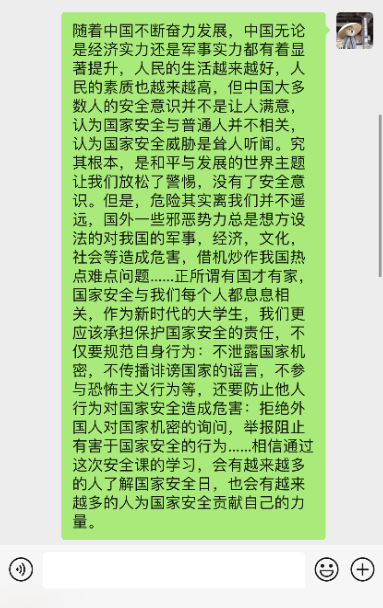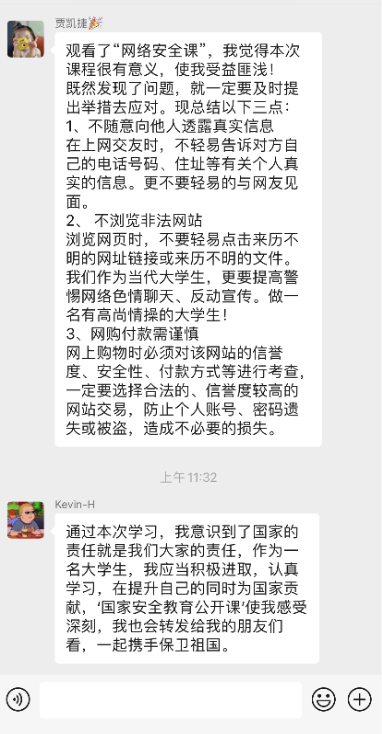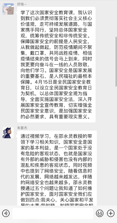 2021年4月15日迎来了第六个“全民国家安全教育日”,今年全民国家安全教育日的主题是“践行总体国家安全观,统筹发展和安全,统筹传统安全和非传统安全,营造庆祝建党100周年良好氛围”。伟德体育组织全院团学组织成员线上观看“千万师生同上一堂国家安全教育课”活动并以观后感的形式积极交流讨论,进一步推动总体国家安全观深入人心,落地生根。