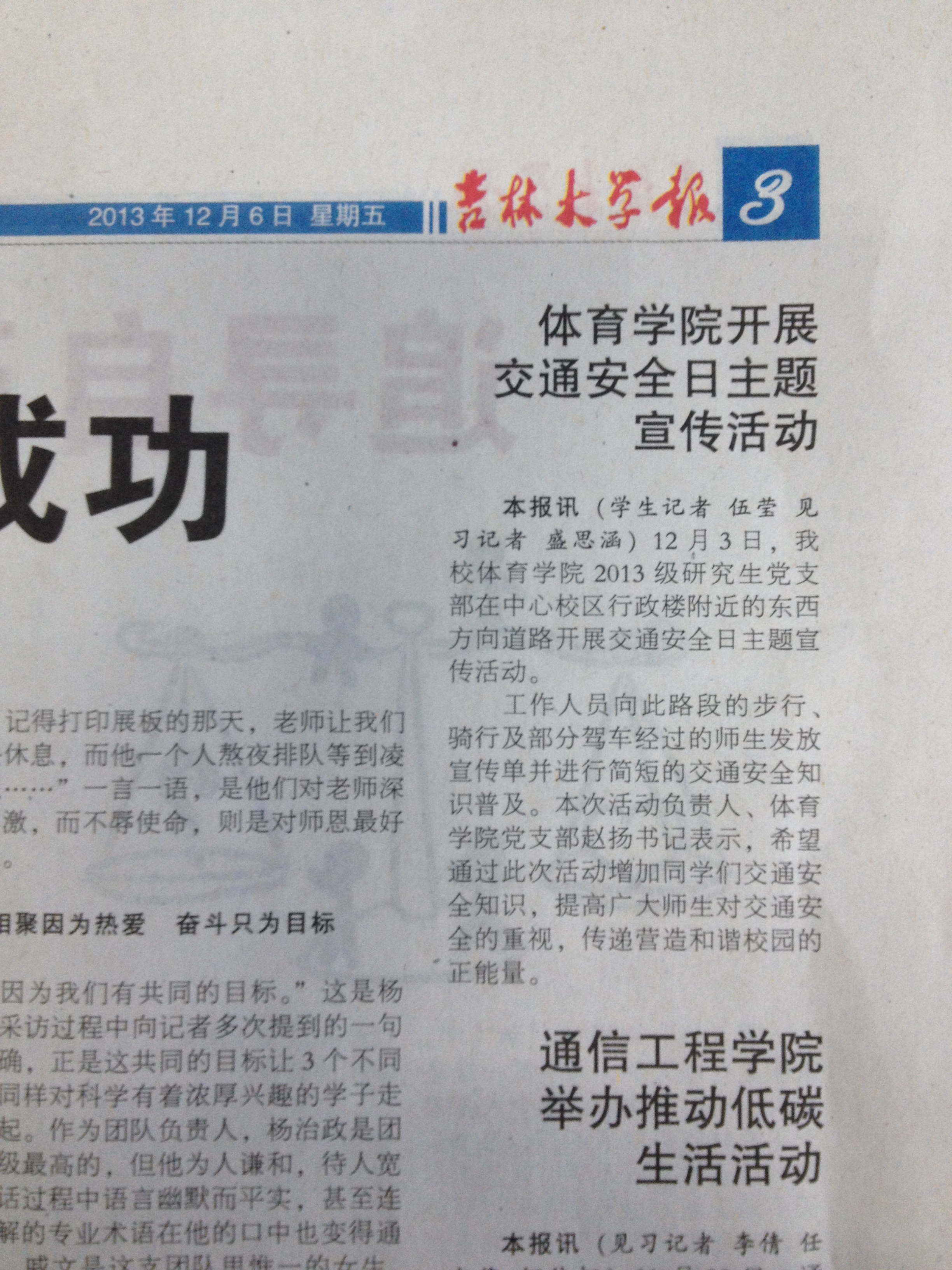 伟德官方网站报在2013年12月6日星期五第506期(复第1064期)第三版多彩校园显著位置报道了伟德体育研究生党支部开展的“宣传交通安全知识•倡导遵守交通法规•营造平安和谐校园”党的群众路线教育实践活动。